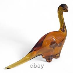 VINTAGE Large 12 Murano Style Clear Amber Glass Apatosaurus Dinosaur RARE! One small chip on the underside of the tail tip, as shown in the listing photos. Beautiful heavyweight clear amber colored Apatosaurus Dinosaur statue, approx 12" long x 10" tall x 3 wide, weighing 5lbs 13.7oz. Etched with what appears to be the word "Vilasen" on the base edge.