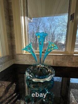 Stunning Beautiful Vintage Murano Epergne Glass 3 Horn Multi Colored Hand Blown Millefiori Italy, 16" tall, 11" diameter bowl base.